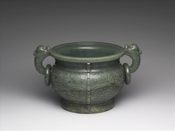 碧玉,色深綠帶灰黑斑。器仿青銅器簋,侈口,圓腹,圈足,有雕獸首雙耳,耳上有活環。口緣與器腹隙地皆飾回紋,二器柄各雕作向上引頸的龍頭,龍口啣著簋之口緣。腹壁二面各飾大型圖案一化動物面紋,臣字大眼,粗厚眉脊。器底刻「大清乾隆仿古」篆款。有木蓋玉頂與紫檀木座,玉頂立雕一龍穿梭蓮花叢中。本器紋飾繁複端莊,做工精美。