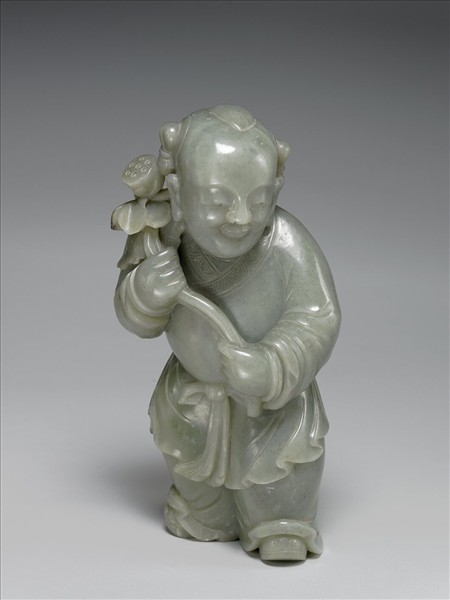 玉質,帶灰黑細斑點。全器立雕為手持荷花蓮蓬之童子。頭梳兩髻,腰間繫帶與蝴蝶結,面帶笑容。嬰孩手持象徵多子的蓮蓬,更加強多子多孫的吉祥意義。