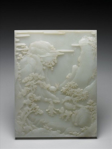 玉質。器作長方板狀形,一面多層次浮雕松鹿山水人物;一面為梅花雉鳥圖,除梅花外,另有竹、靈芝等夾雜其中。