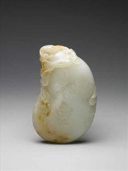 玉質,玉色泛青,有黃色烤斑。器身作扁葫蘆形,以淺浮雕飾瓜蒂藤蔓及蝙蝠於器身上。正反面器身中央,以雙線陰刻雙鉤楷書:「大吉」二字。