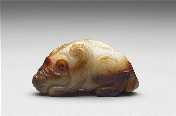 玉質,有大片赭斑。全器為異獸形,作伏臥之狀,四肢向前平跪,頭頂有一角,背上以淺浮雕表現異獸的卷曲狀毛髮。