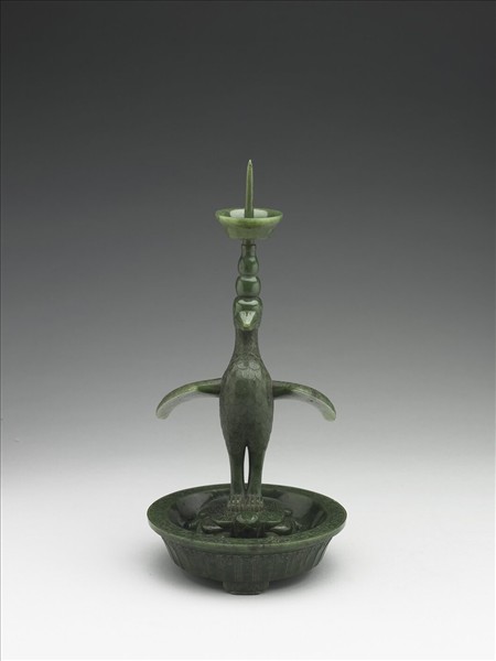 碧綠色的玉,盤心雕一隻烏龜,龜背立一隻展翅的鶴。龜與鶴都是長壽而象徵祥瑞的動物,龜與鶴的組合因而有「龜鶴齊齡」之稱。