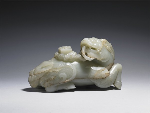 玉質。作麒麟狀,龍首、馬蹄足、有魚鱗的身軀,為想像動物。背上背負書卷,這種麒麟背負書卷的造型,有「麒麟負書」之稱,象徵學問成就。