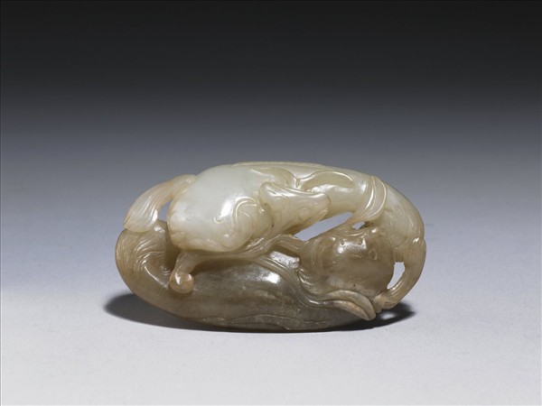 玉泛赭色斑,鏤空浮雕雙鯰魚。「鯰」與「年」同音,因此鯰魚有「年年有餘」之吉祥意義。此器附嵌玉木盒。