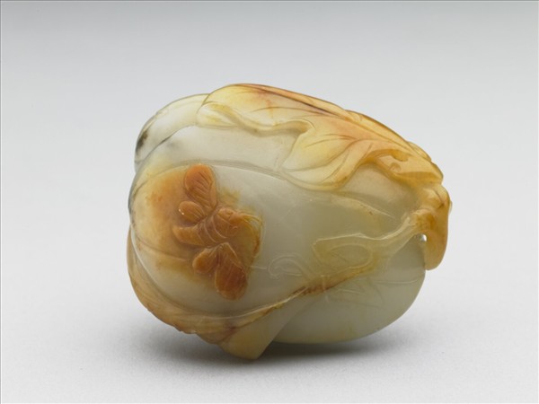 玉帶黃赭斑,雕作大小瓜及枝葉,瓜上停著一隻小黃蜂,清新可愛。