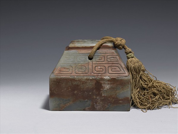 玉質,帶赭色斑。正方形印面,梯形鈕,鈕面淺浮雕龍紋,四面為回紋。鈕上有一穿孔,穿孔上帶一繩穗。