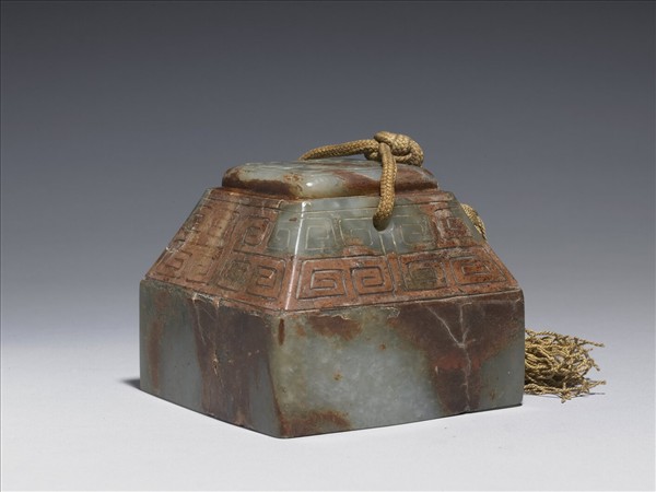 玉質,有赭色斑。方形印面,梯形鈕,鈕面淺浮雕龍紋裝飾,四面飾回紋。鈕上有一穿孔,穿孔上帶一繩穗。