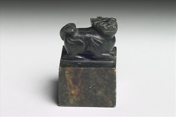 墨色玉帶黃赭色斑。方形印面,獸鈕。