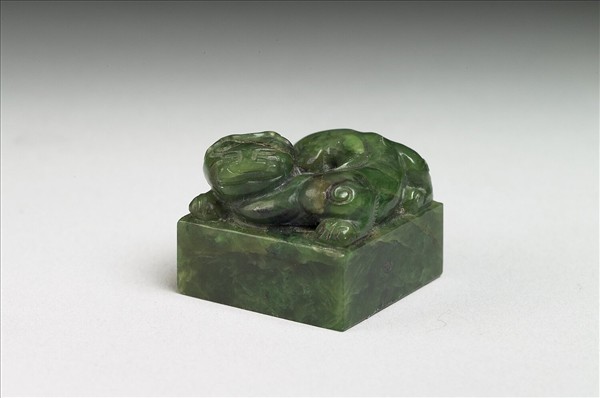 碧綠色玉帶白斑,方形印面,雕獸鈕。
