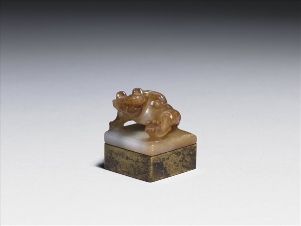 利用漢代玉劍璏殘斷部分,下方加貼方形銅印,改製成印章。原來玉劍璏上立雕一正在扭身搏鬥的野熊,剛毅勇猛,力道十足。多已沁成褐色。