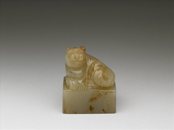 玉臥伏虎鈕方印,印面未刻,器身滿布赭斑。