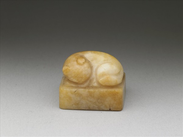 玉獸鈕方印,玉有黃斑。印面未刻,印身有長傷裂。