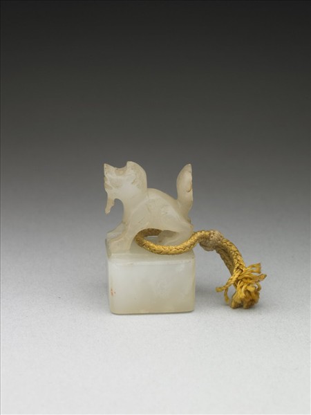 玉獸鈕方印,獸作蹲坐狀,尾上揚。玉頭帶灰,印面未刻,印身有璺,附繩。