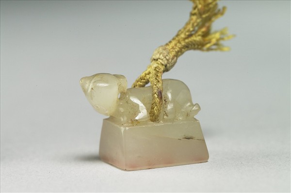 玉獸鈕方印,印身有璺,印面為篆文,有一穿,附繩。