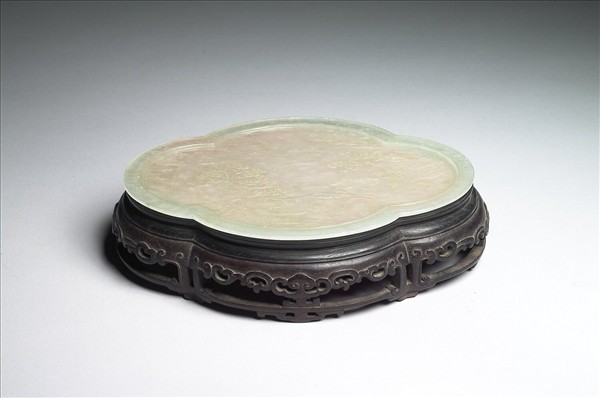 玉質。海棠花式盤,盤面平淺,附木座。盤心琢淺浮雕松石、小橋、樓閣、山水等點景,人物穿插其中,口沿琢雲紋一圈。