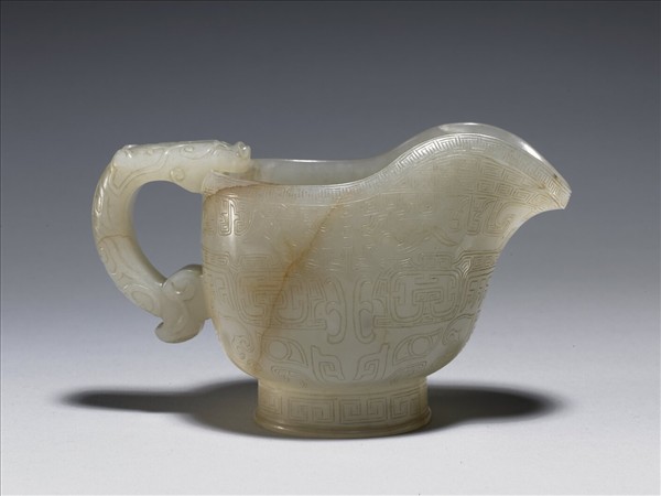 玉觥,仿古銅器觥,斂口、深壁、圈足,前有鎏,後有獸形鋬。器身及圈足有璺。腹上層雕龍紋,下層琢獸面紋,口沿、足均飾回紋。
