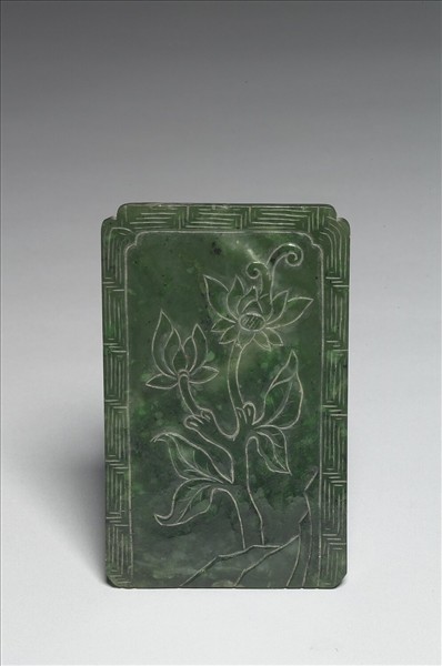 碧玉,玉版,作長方形,雙面陰刻,一面琢竹葉,另一面為花葉,器沿飾回形紋。