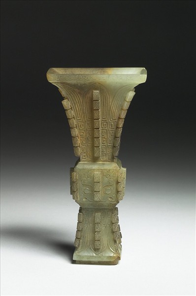玉觚,仿古銅器型,侈口、長頸、圈足,有棱脊。脰、足均飾淺浮雕蕉葉紋,腹飾獸面紋,棱脊飾幾何紋。玉有赭斑,多處傷缺。
