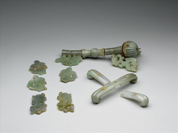 玉質,帶雜斑。全器傷斷脫落。器底為以十字形組合為架,器柱飾瓶觚形,配飾為片狀龍紋,可固定於器柱上。(與故玉003059N000000000成對)