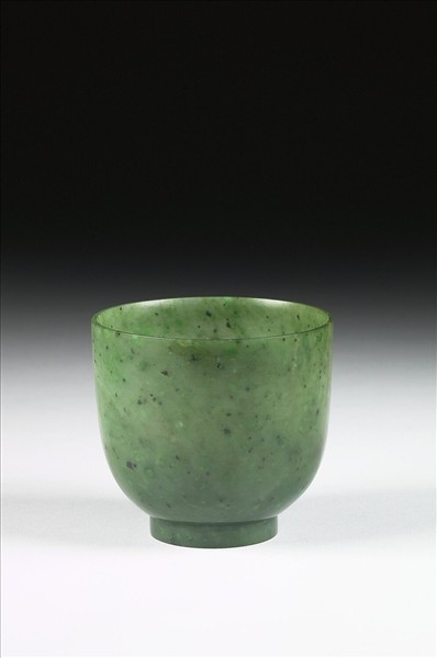 碧玉杯,直口、深壁、淺圈足,口沿至腹壁有傷璺。