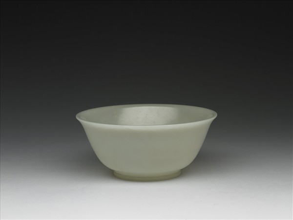 玉碗。侈口、矮圈足,外底心有「乾隆年製」隸書款。