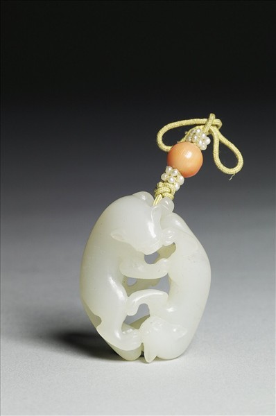 玉質,立雕雙螭。首尾相連,附有珠結繩。