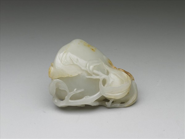 玉質,器身有璺。全器立雕雙桃,其上附有枝葉、蝙蝠。