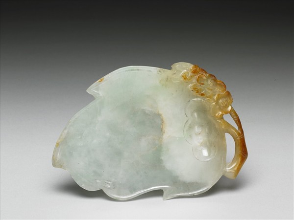 略呈半透明的翡翠,淡綠色的翠玉琢成秋海棠形硯台,較少的翡紅部分雕作海棠花及莖部。設計頗富巧思。帶紫檀木匣。