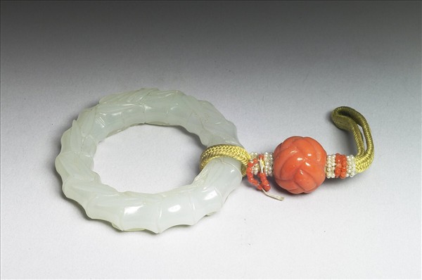 玉質。圓環,環仿竹節,附有珠結繩。