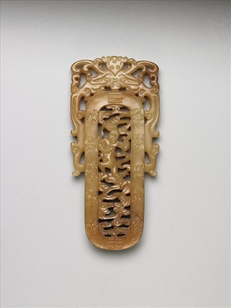 玉質,呈土黃色。長方形玉板狀,中間一長橢圓環形,環上正面浮雕天干十字和乾、坤卦象,背面浮雕地支十二字;環內鏤雕一奔走童子,長髮飄揚,其周圍佈滿雲紋;環外上部鏤雕鳥首獸身的想像動物。