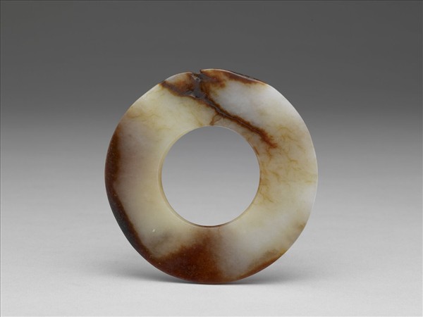 玉質,大片赭紅斑,尚稱溫潤。厚薄不勻,有裂紋與缺傷,孔由兩面對琢而成。