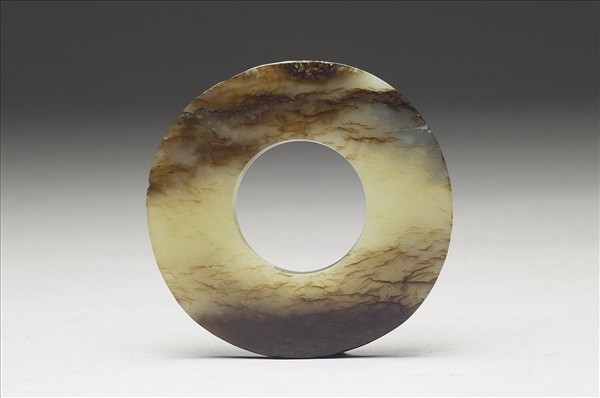 玉質,「糖包白」玉料。圓璧形,器一面平整,另一面有一道直線切痕,厚薄不勻,外緣有幾處小崩傷,孔壁整齊。