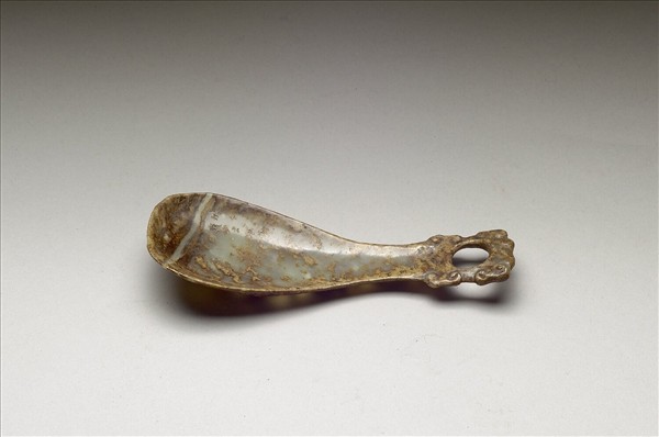 玉質滿佈褐黃沁染斑紋。匙形帶柄,柄端有一大穿孔,四周雲紋為飾。