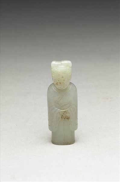 玉質,色青白,略有赭色人工染斑。玉人作寬衣博袖狀,頭上有冠,雙手互握,形貌恭謹,自頂至底,直穿一孔,可作穿戴用。此玉人與故玉003127呈一白一棕配對,乾隆皇帝將其盛裝於匣冊內,匣外並御題「仙毫春色」。