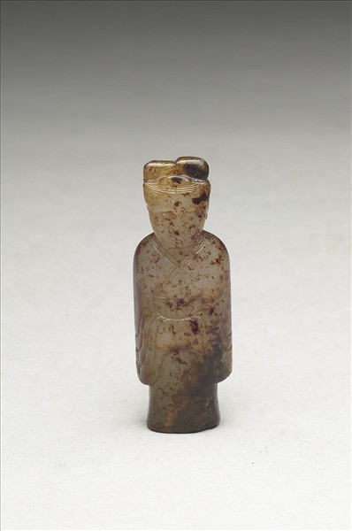 玉質,有瑕斑,周身帶赭褐色斑紋。玉人作寬衣博袖狀,頭上有冠,雙手互握,形貌恭謹,自頂至底,直穿一孔,可作穿戴之用。