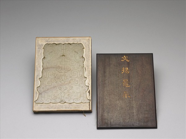 玉質有黃白瑕斑及褐黃瑕紋。戚形無刃,面上滿琢龍紋、雲紋及圓圈形紋,整器輪廓亦隨琢飾紋樣凹凸出棱,器上方琢一穿孔。
