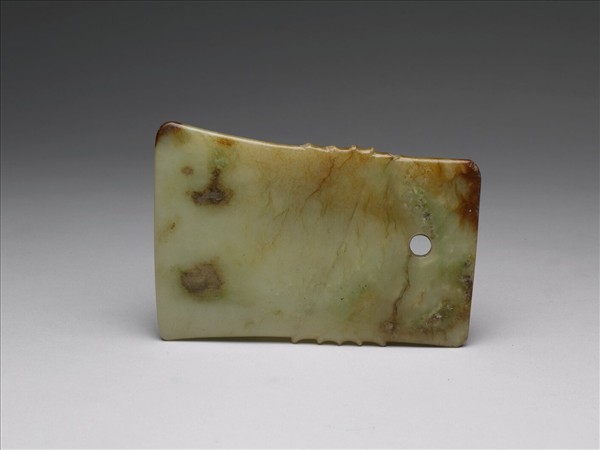 黃色玉質,局部帶有綠色及褐色斑,質地溫潤。器身作略不對稱梯形,近背端鑽有一孔,平背,平刃,兩側各刻飾五個牙飾。