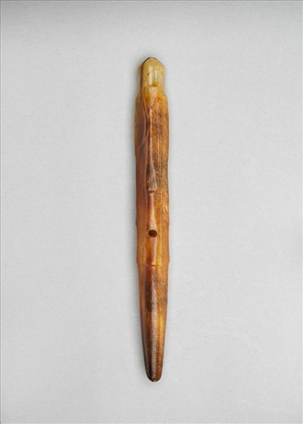 以鳥為造形或紋飾的玉器,正是史前華東各氏族中宗教人物必備的行頭。如良渚文化冠狀器(梳背)、三叉形器等頭飾的造形來源,可能都與飛鳥有關。後石家河文化的鳥紋笄較為寫實,描述鷹鳥棲息時雙翼併攏的姿態。這種造形玉笄甚多,多在上半截雕紋,兩圈弦紋以下則保持光素的圓椎柱體。鳥翼疊合附近多鑽一橫穿,可能可穿繫絲線繞繫在髮髻上。當頭頂插飾鷹紋笄,就有如神玄之鳥降臨,關愛庇佑世俗子民。 這件鷹紋笄比較瘦長,且鳥頭該呈現的鷹鳥風格也渾沌不明。器身大部份呈褐色斑,應是明晚期至清初時,被古董商染色之故。