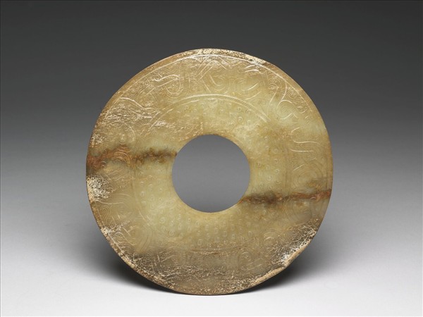 原始玉質為黃白色,以齊家—龍山系素面玉璧改製而成,現呈深褐色。原因除了早先埋藏受沁變色之外,收藏流傳過程中可能也略有染色。此類雙身獸紋玉璧於戰國中期開始出現,西漢廣為流行。