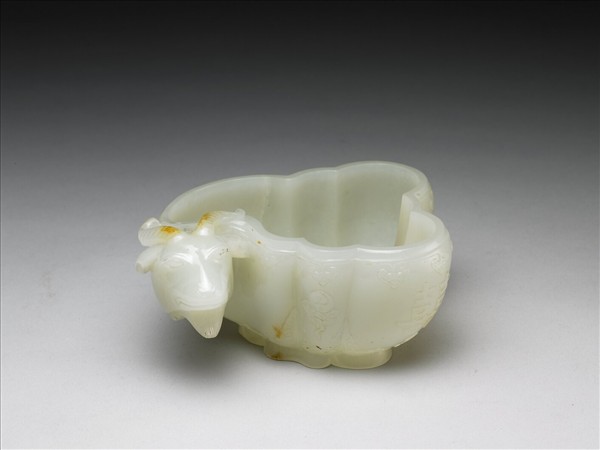 玉質,口緣曲折,柄雕羊首形,器底飾一開展朵花。紋飾選用如意雲、雙喜、太極與吉羊,具有濃厚的吉祥意味。