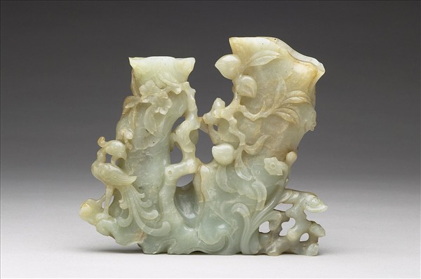 玉質。器身主要琢作大小中空樹根各一,四周琢附鳳凰、桃樹、水仙、靈芝等物象。鳳凰直立回望、水仙搖曳開放,桃樹幹老而葉盛,瘤結宛然,並結有桃實數顆,又有靈芝獻瑞,正是呈現吉祥寓意。器身有「乾隆年製」四字篆款。