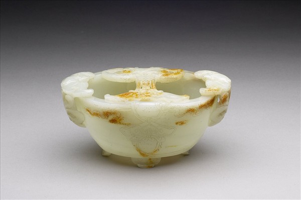 玉質,局部染色。器身琢作橢圓形水盛,有四如意形足。雙耳雕作葉狀,盛面琢有蝙蝠五隻與一「壽」字,器身琢飾磬紋及綁縛在磬上飛帶紋,意喻「五福慶壽」。