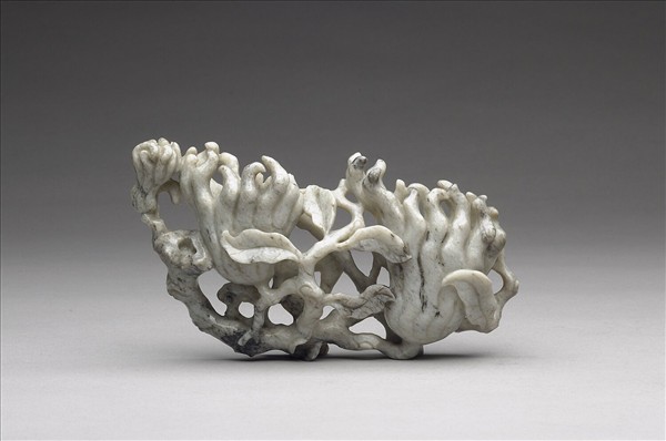 玉質。器以兩佛手為主,佛手中空而成水盛,佛手四周雕鏤佛手枝幹、竹子、靈芝等物象,有祥瑞之意,附錦座。佛手基部刻「乾隆年製」四字篆款。