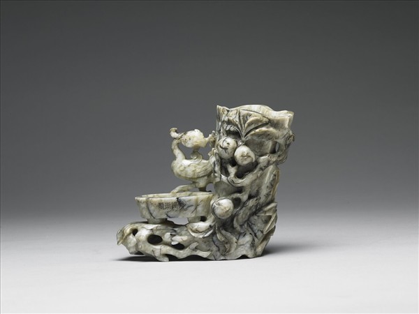 玉質。器琢一中空樹幹為主體,樹根向左平伸使整器呈L形,樹根上琢附一小盂,盂上立一鳳回首。樹根表面浮雕桃樹纏繞樹幹。小盂上有「乾隆年製」四字篆款。