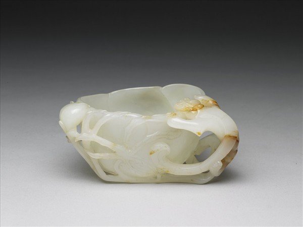 玉質。器作葵花形。斂口,深壁,琢連夔龍為耳,器面浮雕螳螂一隻。內心淺琢花瓣紋五道,外壁滿琢花葉枝幹。