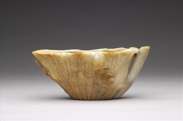 器身作一片荷葉,周身飾筋絡紋,綴有雙螭及蟹,柄反向上折於葉旁,中空通於器內,可以作流。玉質溫潤,螭、蟹及器身部份,利用玉皮為之,青黃相映,極為美觀。一面邊緣有草書「黃甲登科」四字。一面器下方鐫篆書「子剛」二字款。