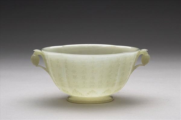 玉質,琢作一朵盛開的罌粟花形碗。底部用另一片玉琢好再貼上。底部也雕成一朵平展的罌粟花,交叉覆疊四片花瓣,花心雕琢細密。腹壁下緣繞一圈莨苕葉,自兩側下方沿著腹壁向上伸長三枚莨苕葉,最長一枝延伸至口沿處捲折,垂掛一花蕾,輕觸第二片葉尖。質美工精。器外壁琢乾隆三十五年(1770)御製〈詠痕都斯坦白玉盃〉詩與跋,譽之為「製薄如紙,良材巧琢,非中土玉工所能仿彿」。