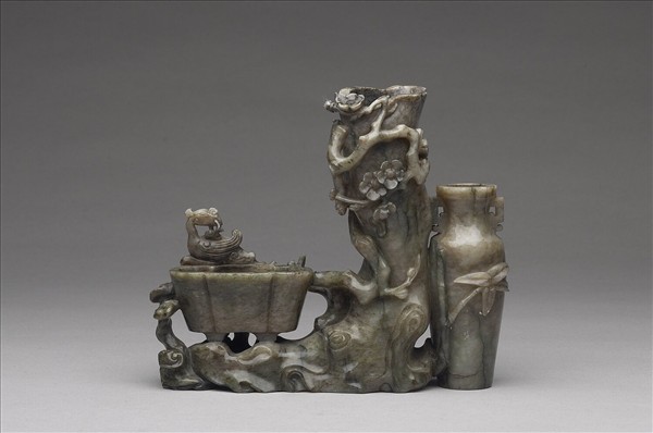 玉。全器以整塊玉雕成,三個小瓶以流線形山石底連結,中央立雕梅樹老幹為瓶,纏繞新枝梅花;旁有雙耳深腹小瓶,瓶上淺浮雕竹枝;另一側是海棠瓣式小盆,旁側有鳳凰與靈芝。梅幹上陰刻「乾隆年製」篆款。