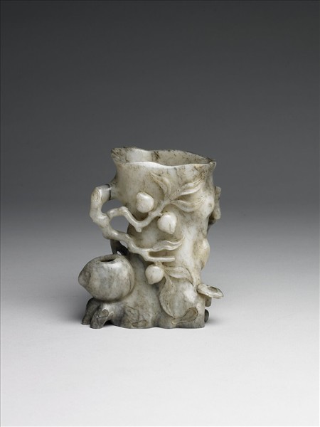 玉質,有黑赭色斑紋。平底,全器作桃幹一段,中空為容器,器身上雕桃花、桃實、細枝、葉片及靈芝,一側在底部旁有一較大的桃實,亦挖空,可為水盛。大桃實外壁琢有「乾隆年製」四字篆款。