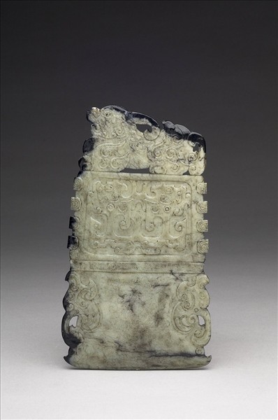 玉質,邊有黑色斑紋,器面黑色沁入纖維情況明顯。器仿古玉戚之形,但裝飾性濃厚,頂端鏤雕辟邪,中段淺浮雕獸面紋,外緣側各有凸出齒四枚,以弦紋與下段間隔,下段中間淺凹雕雲紋,二邊鏤空雕如意雲頭紋。